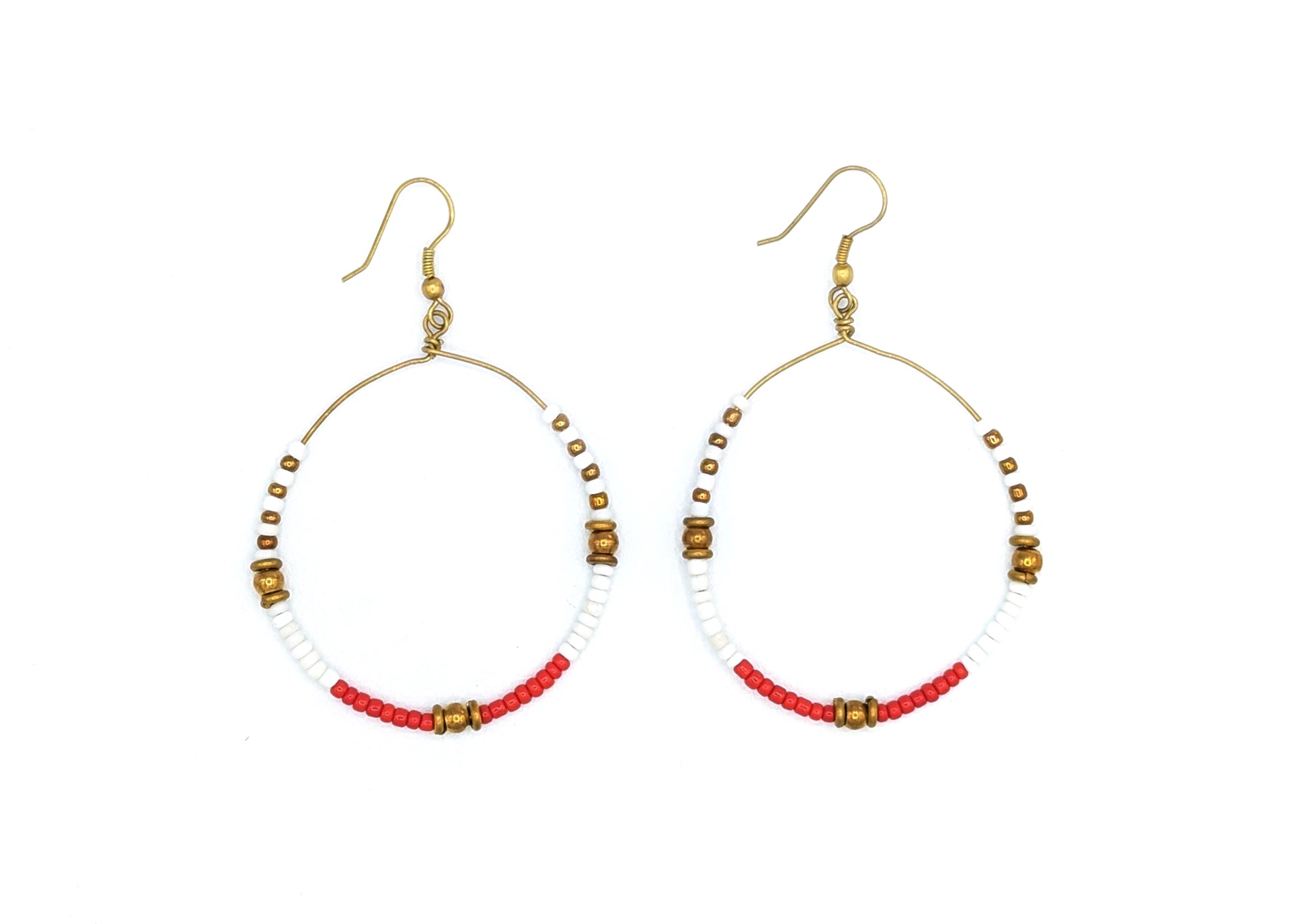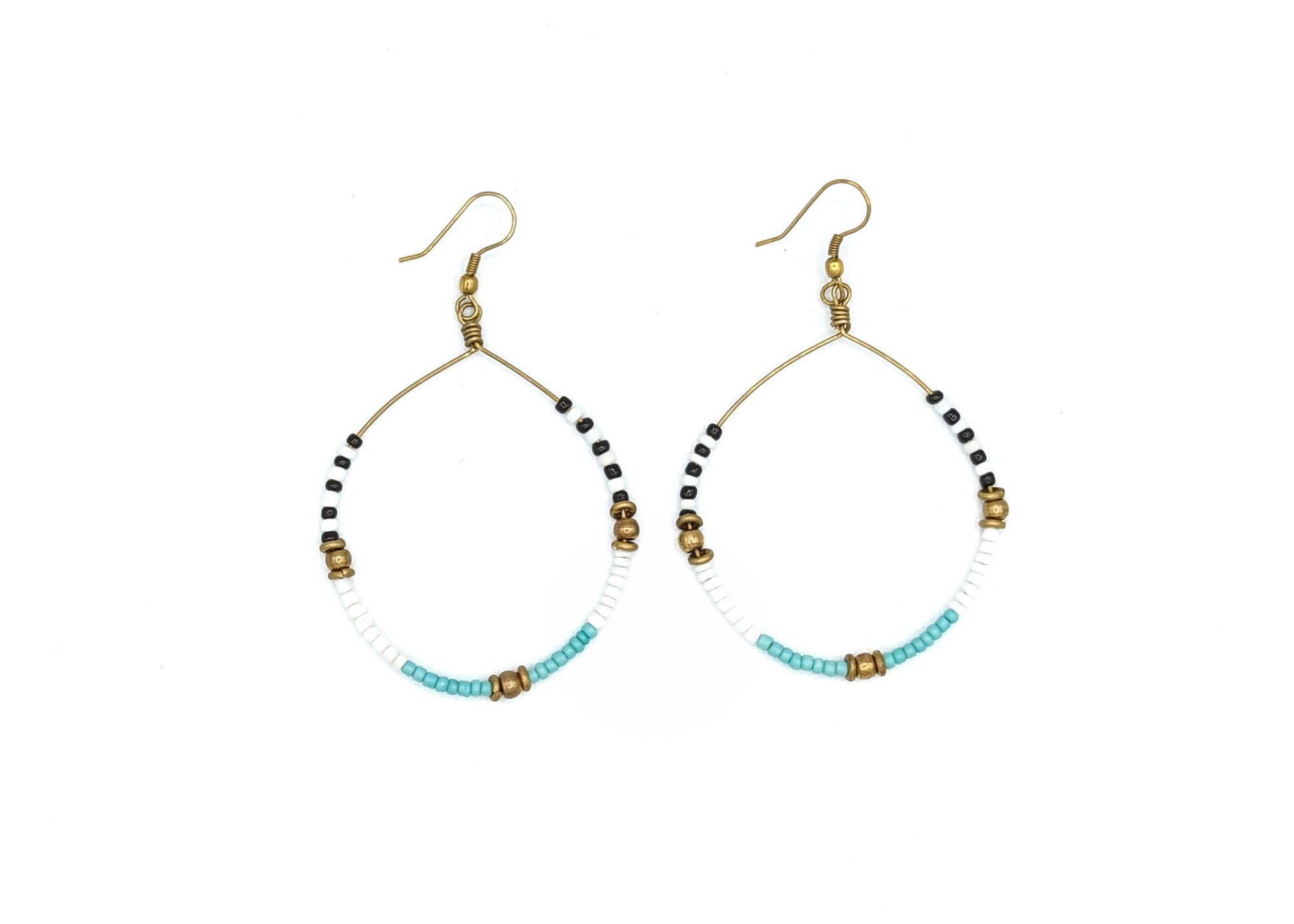 Tumaini means "hope" in Swahili. Our mission at Grain of Rice Project is empower our artisans to experience a more hopeful future. These earrings are simple, but fun, and match just about anything. Dress them up or down. Pair them with our Tumaini Necklace in our Dream Big Collection. Each hoop is filled with white and black glass beads as well as brass beads. Created by our artisans in Nanyuki, Kenya.