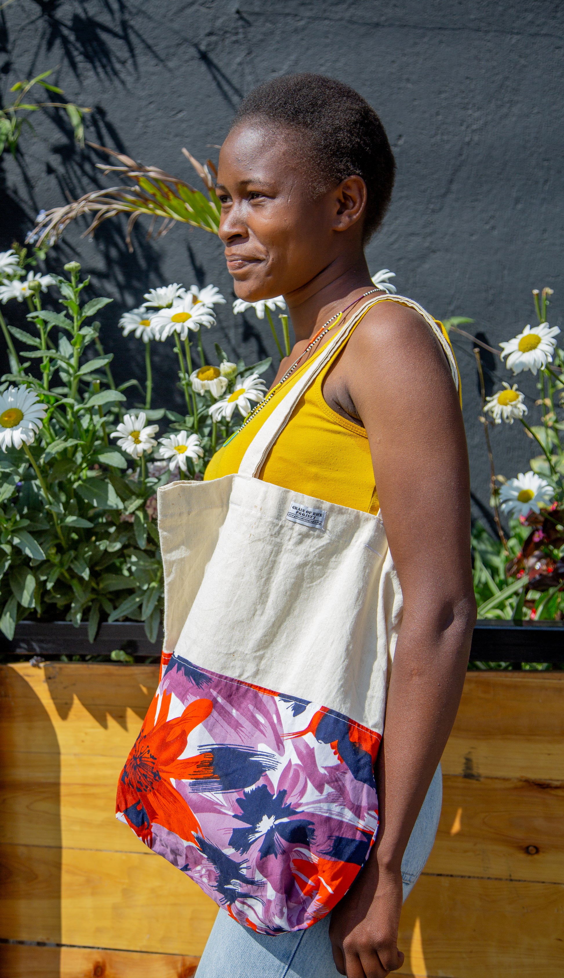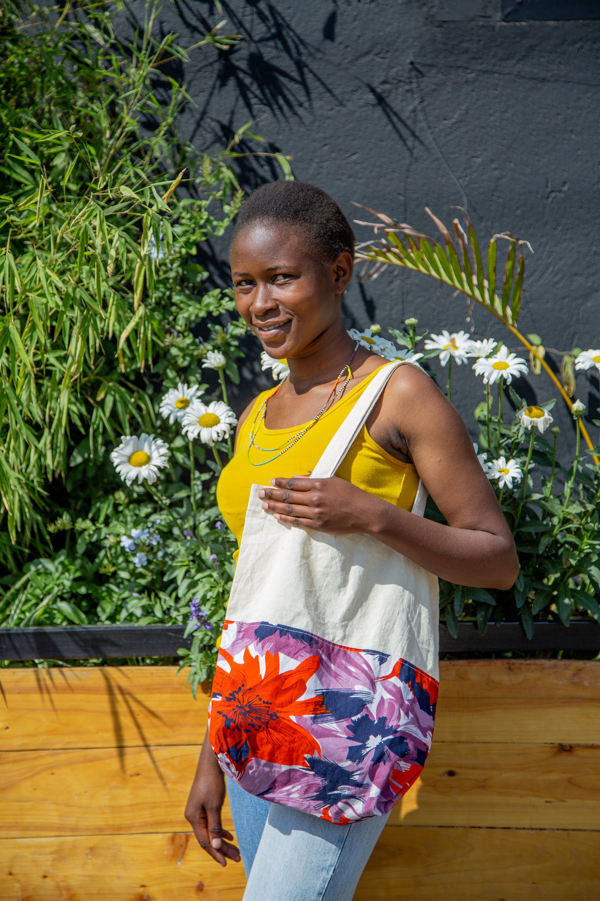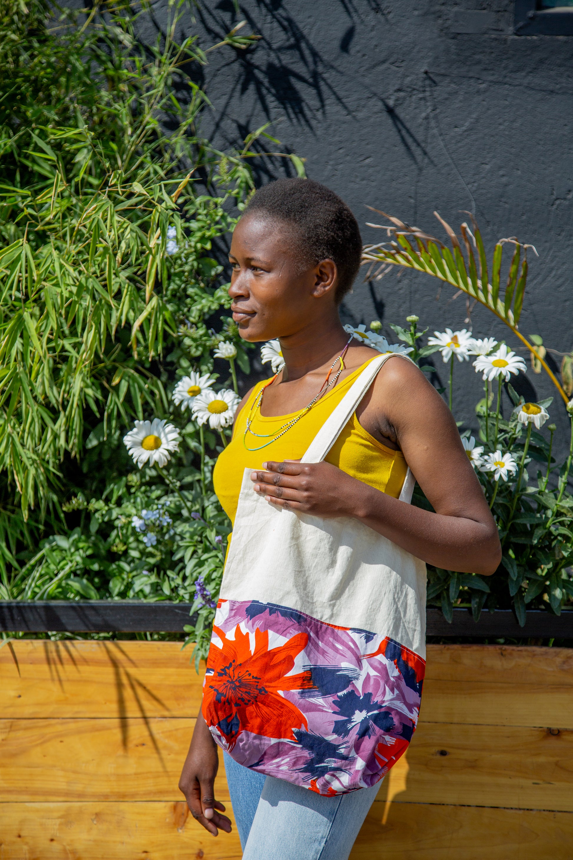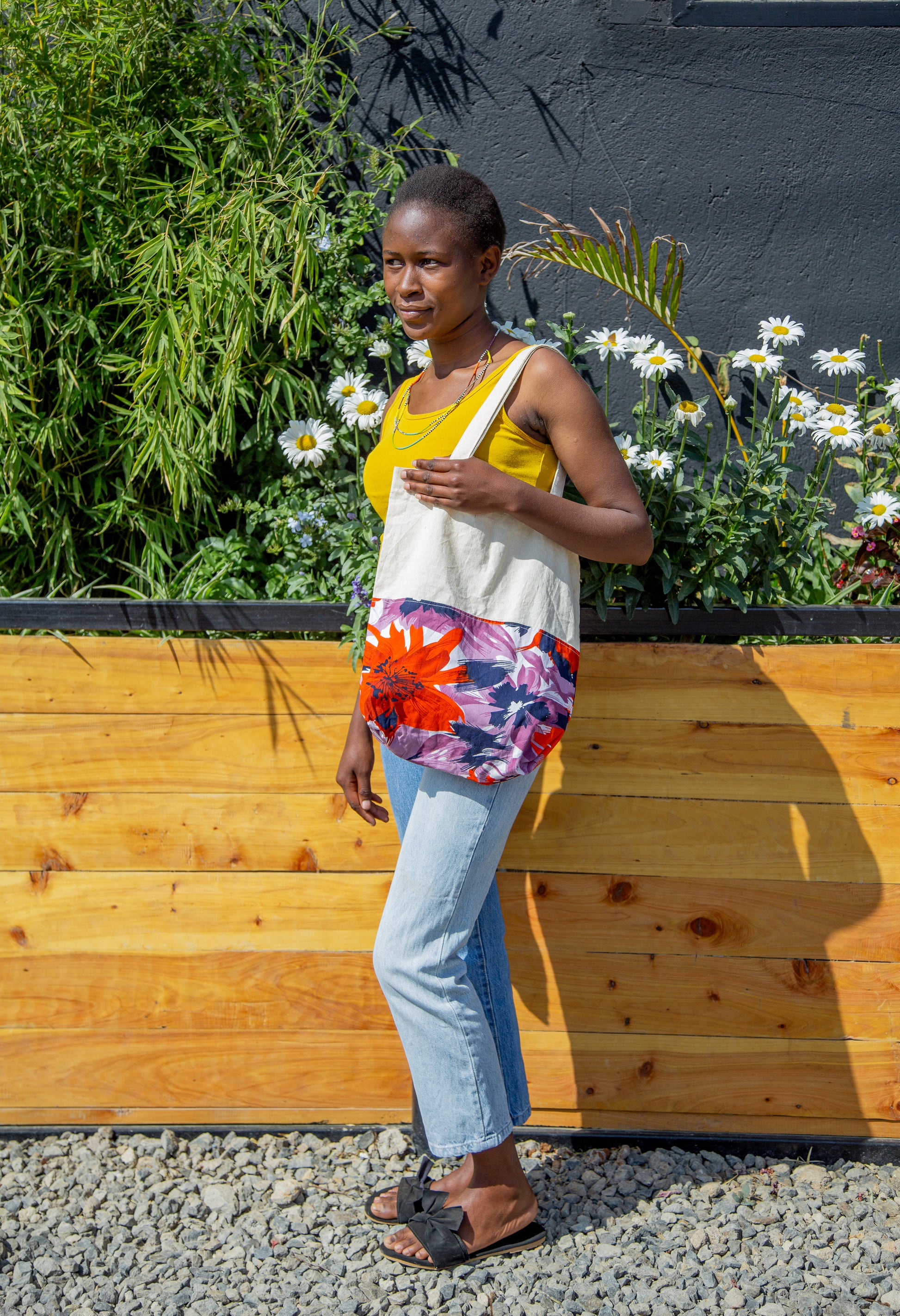 Our Bloom Canvas Tote Bag is designed with the colors of spring in mind. This bag can carry it all - books from the library, essentials on an outing, snacks for a picnic and countless errands and activities in between. Made with a colorful African patterned fabric bottom and a sturdy canvas top and strap, each bag is pieced and sewn together by our artisan team in Nanyuki, Kenya.