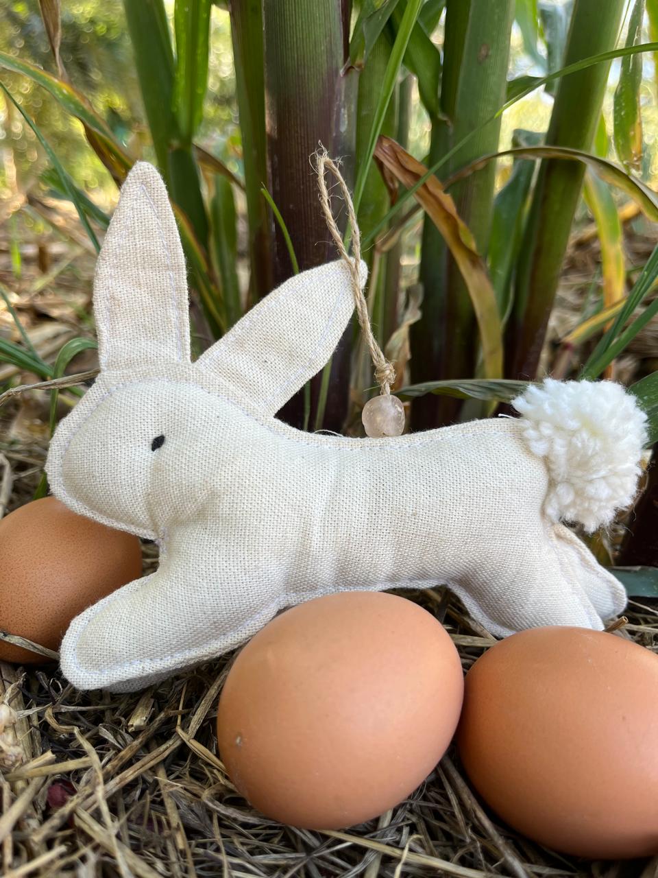 Add to your spring and Easter decor with our Canvas Bunny. The hand-sewn pattern created by our artisans on canvas fabric includes a loop for hanging, off set by a vibrant glass bead. This bunny could rest with the table centerpiece, be added to a colorful wreath or hang as a decoration all on its own.