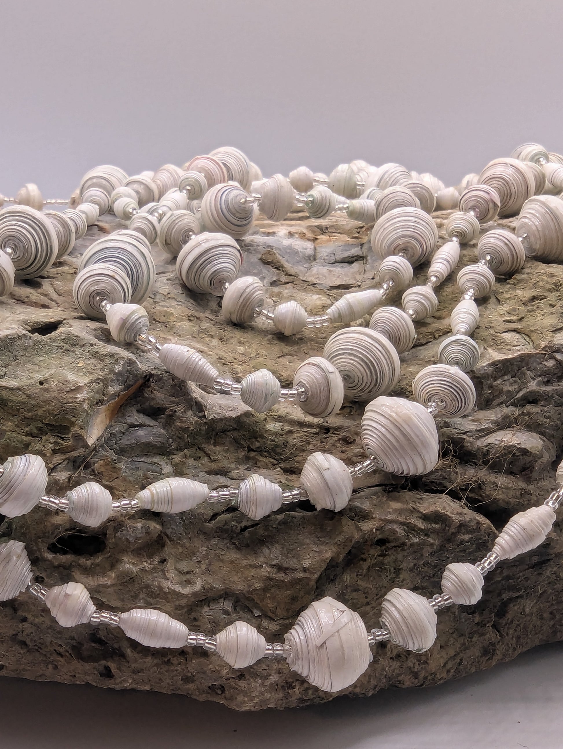 Enhance your holiday décor with the White Paper Bead Garland, featuring individually rolled paper beads for a handcrafted, unique look. Perfect for draping on Christmas trees, mantles, or shelves, this 7 foot garland adds a charming and versatile accent to any festive display. Its delicate design brings warmth and texture to your seasonal decorations.