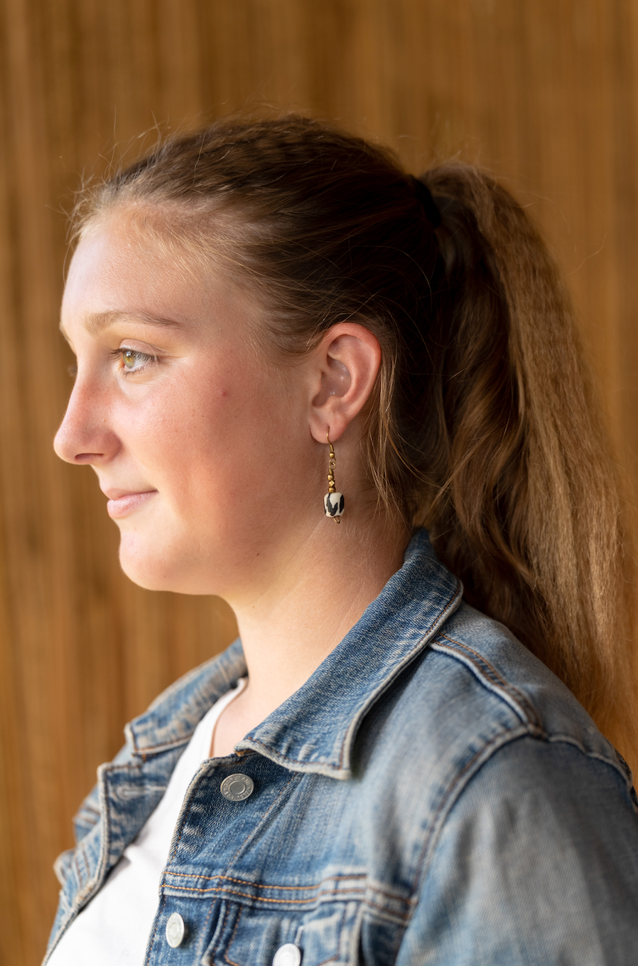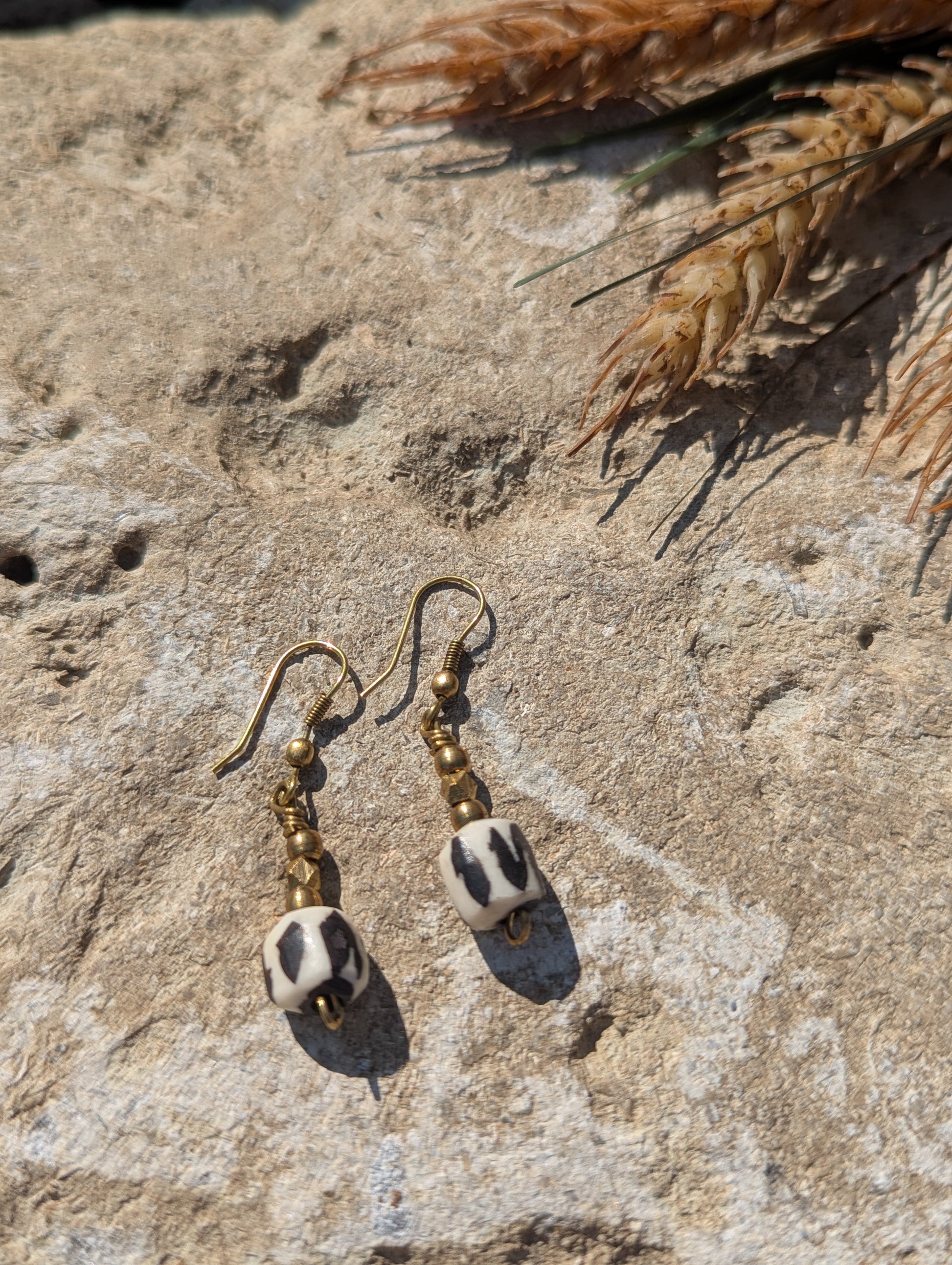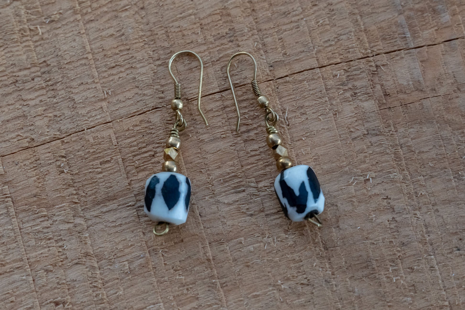 These unique earrings feature ethically sourced bone beads and are made using the ancient technique of Batik dying. Expertly crafted, they are a stylish year round addition to any outfit.