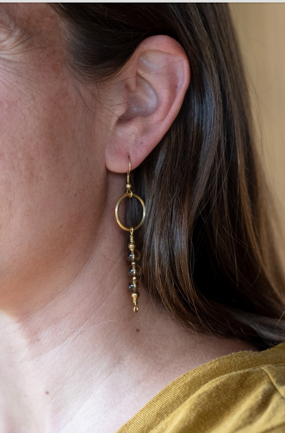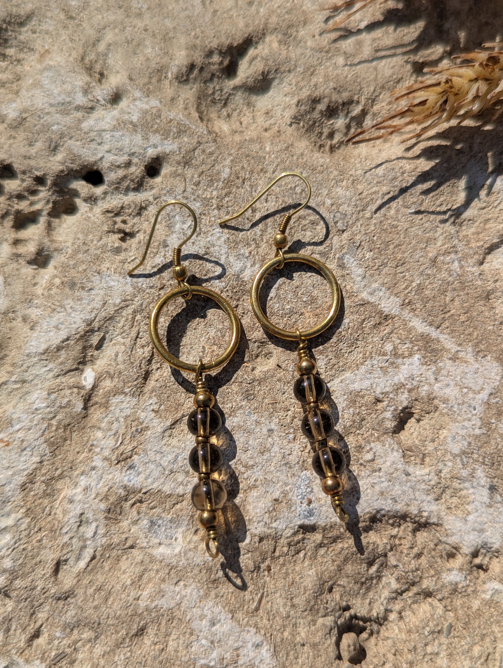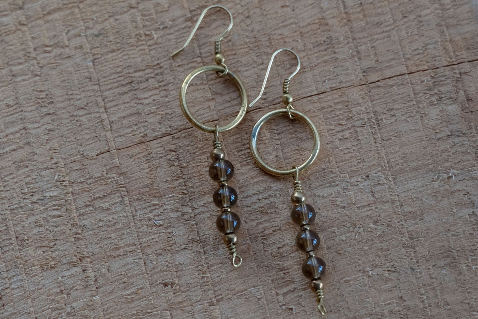 Welcome the fall season with the Autumn Cascade Earrings. Featuring three brown beads cascading from a brass hoop, these earrings add a natural, earthy touch to any outfit.