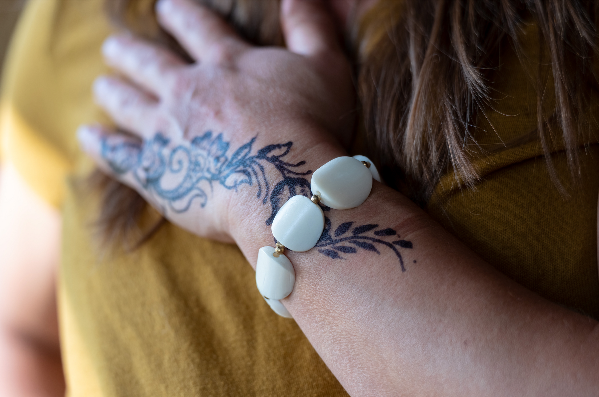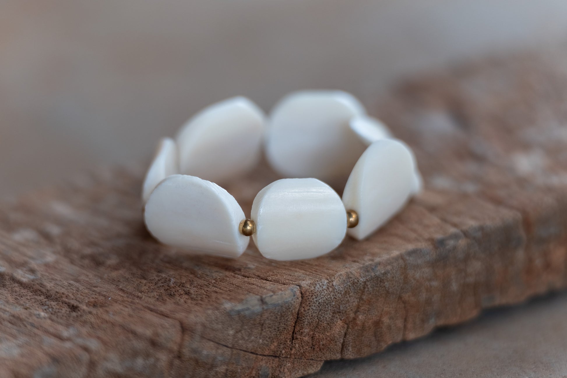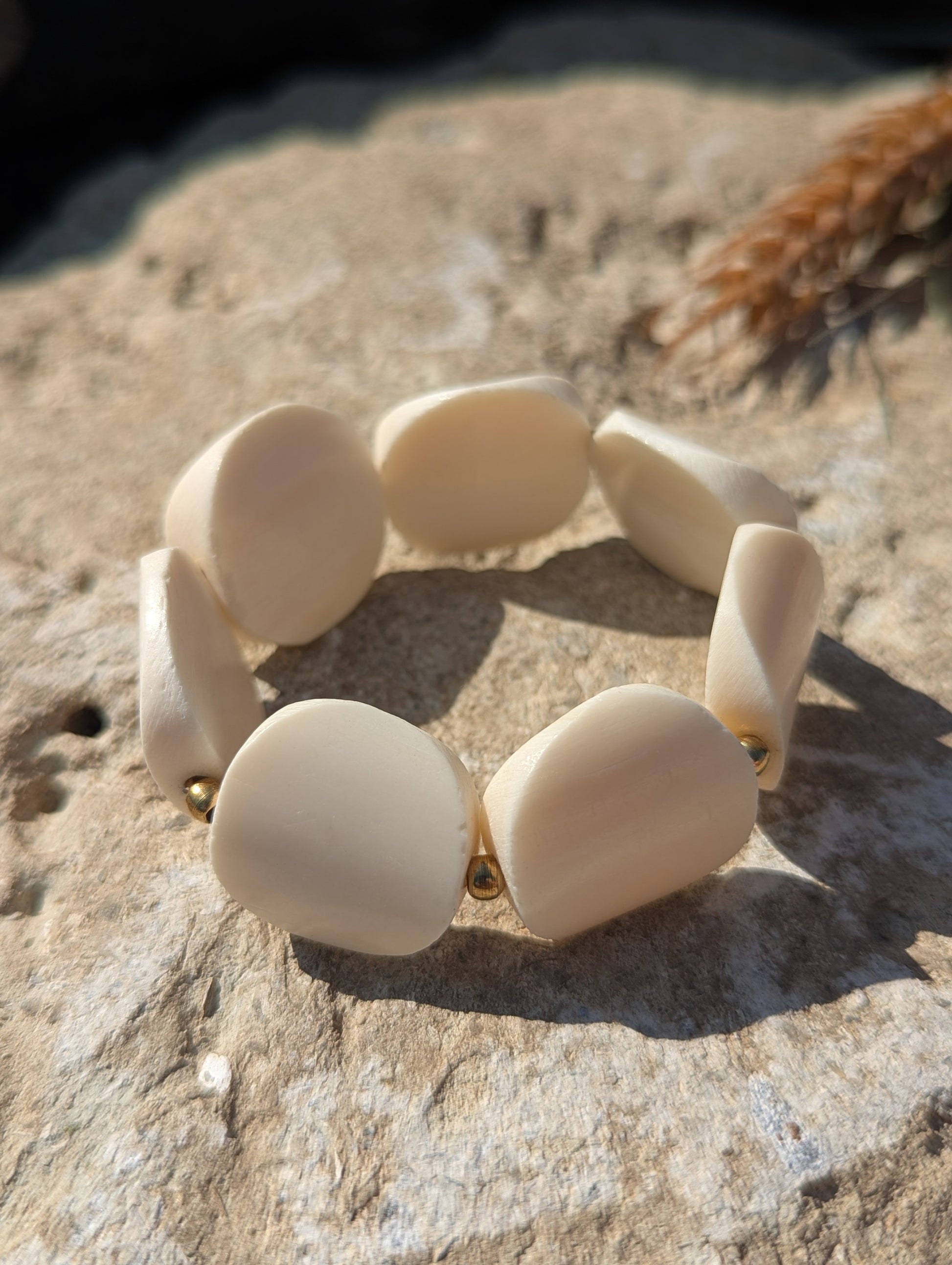 Crafted from ethically sourced bone, the Harvest Moon Cuff Bracelet features hand-carved circles inspired by a full moon. Each piece is separated by a brass bead and strung on elastic, allowing for a comfortable fit for all wrist sizes.