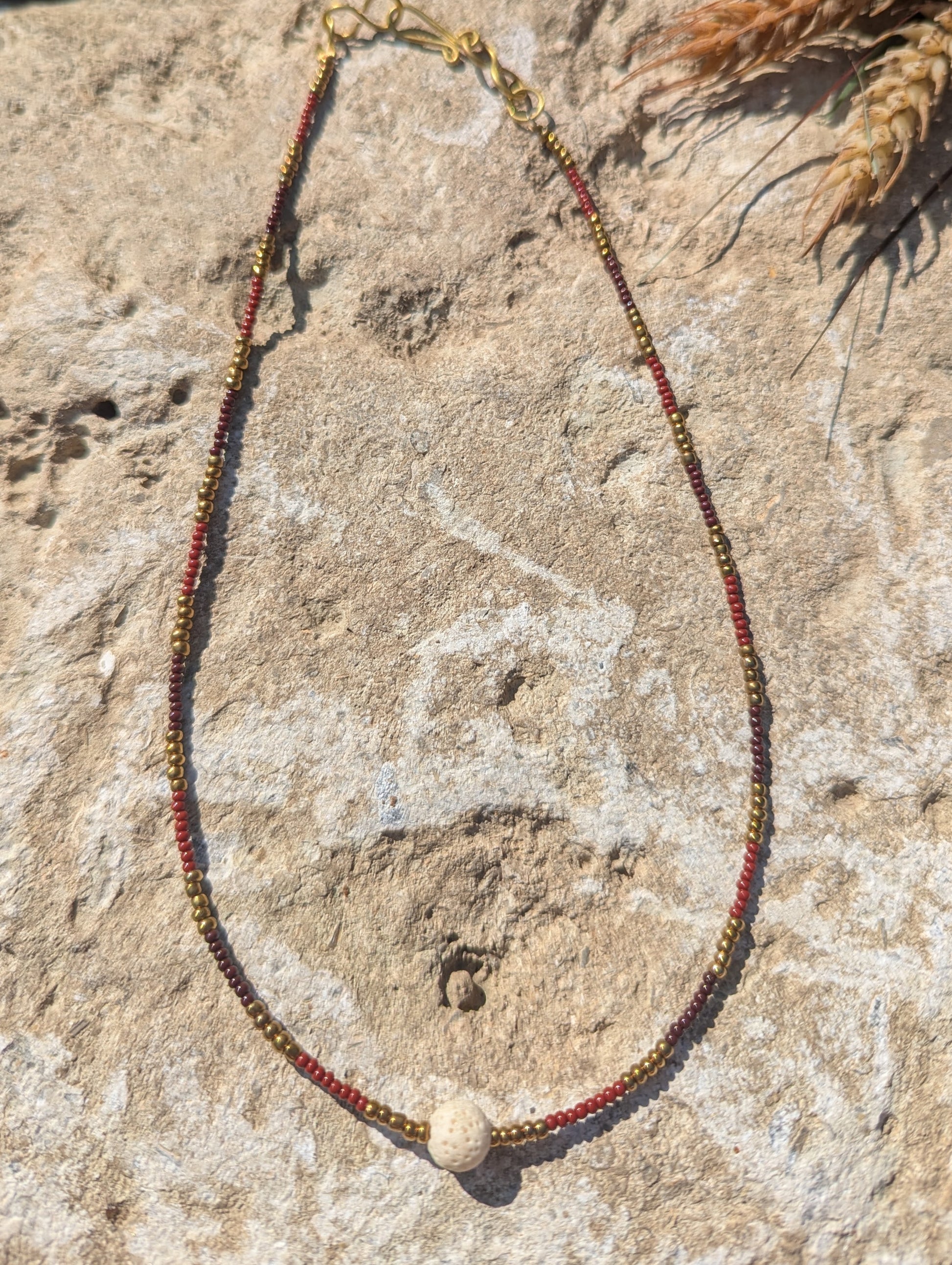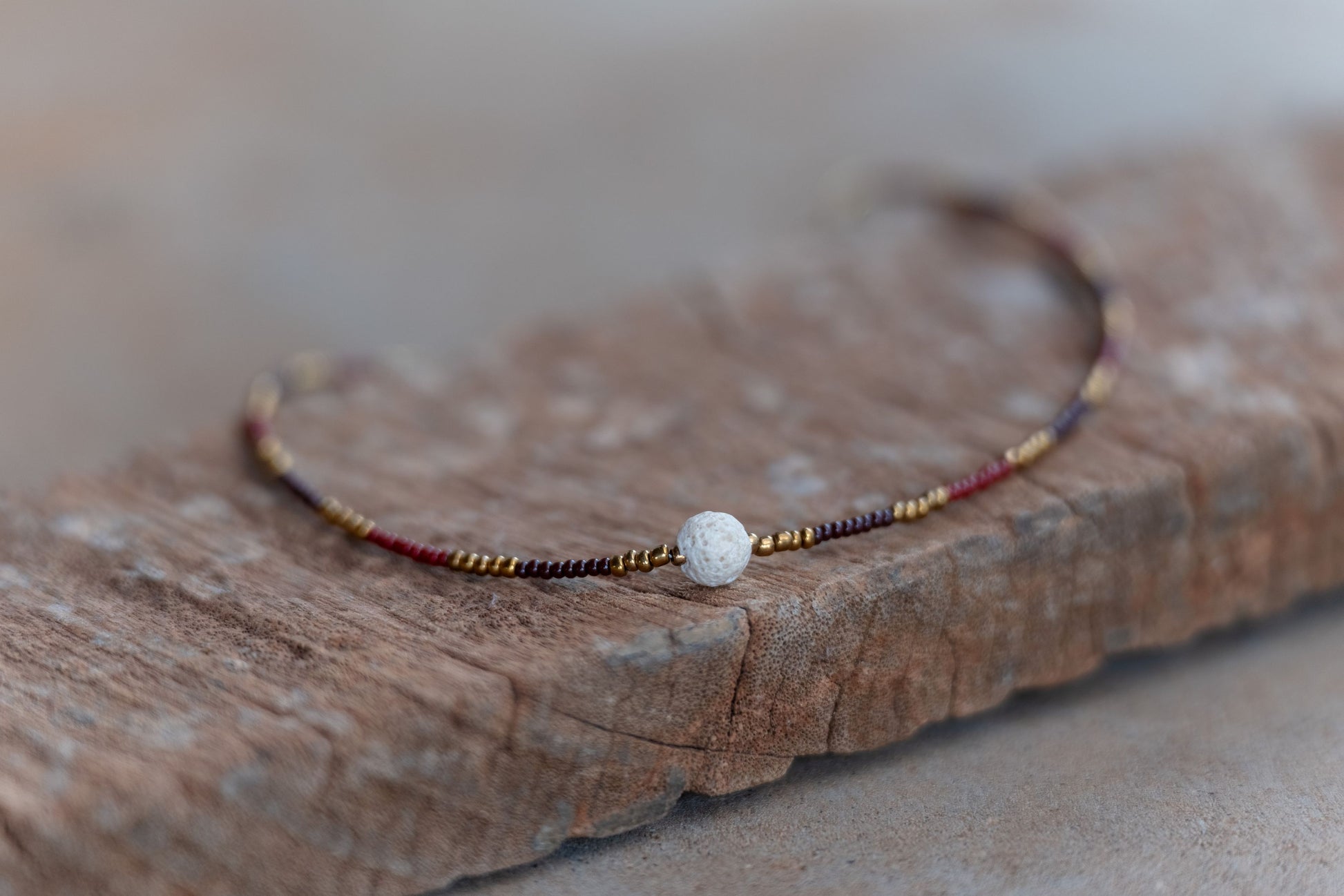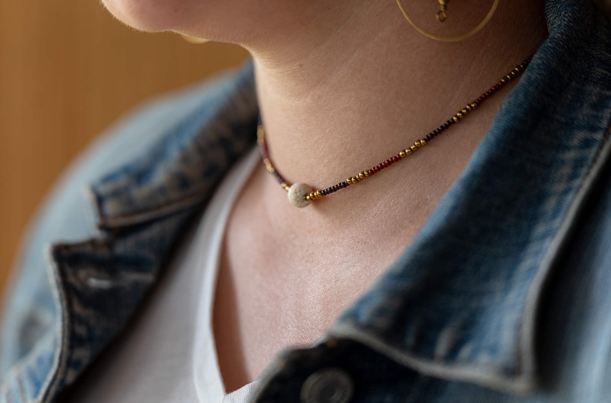 Our Lava Bead Necklace sits gracefully at collarbone length, perfect for layering with other pieces or wearing alone as a stylish choker. Featuring a unique center lava bead, it doubles as an essential oil diffuser, allowing you to enjoy your favorite scents throughout the day. Combine fashion and function effortlessly with this versatile, fall-inspired accessory.