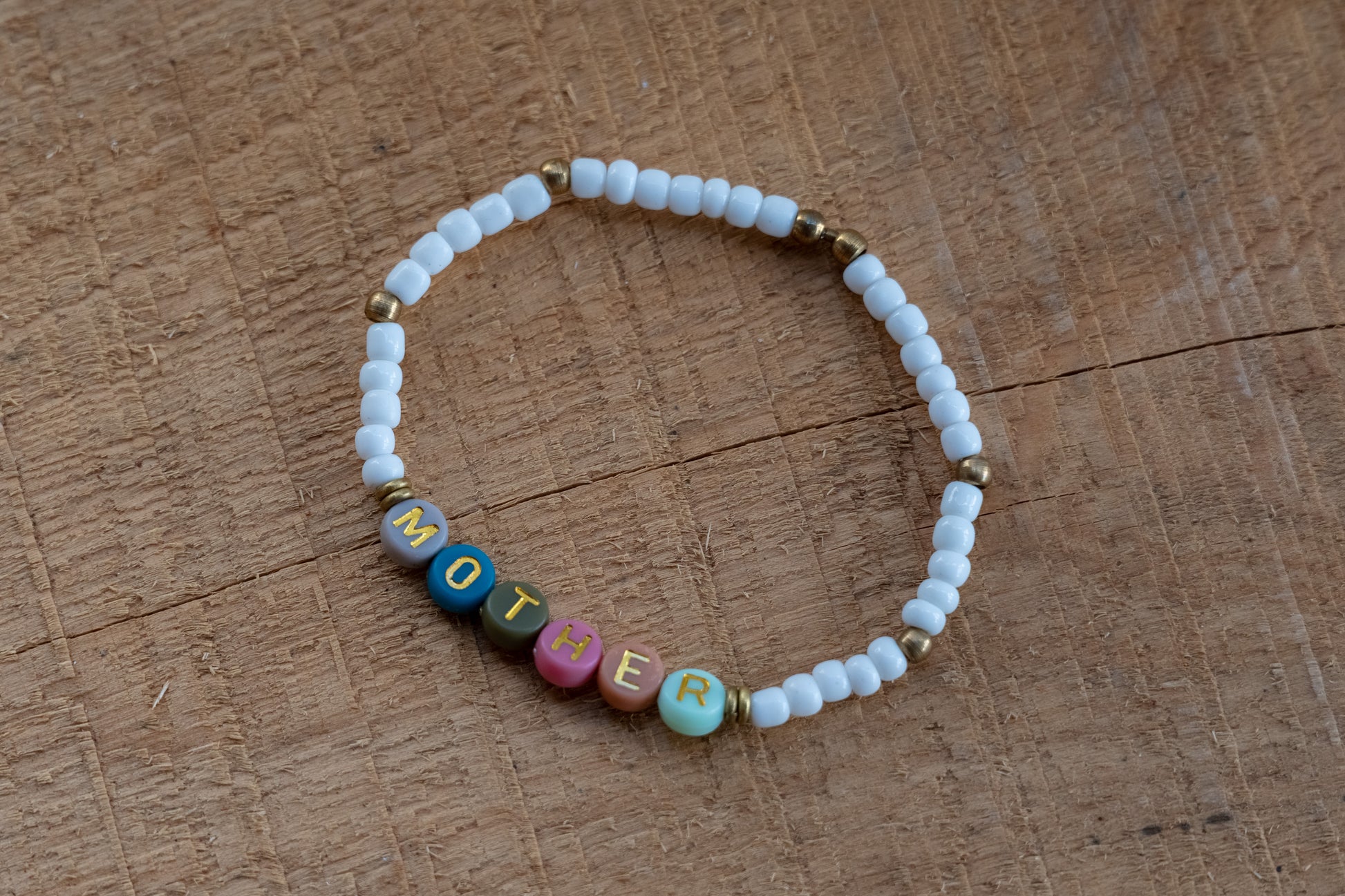 Celebrate the special bond with your mother with our Mother Bead Bracelet. Crafted with muted letter beads strung on elastic for a comfortable fit, it is beautifully finished with white and brass seed beads for a subtle yet meaningful touch. This bracelet makes a thoughtful gift that honors the love and strength of mothers everywhere.