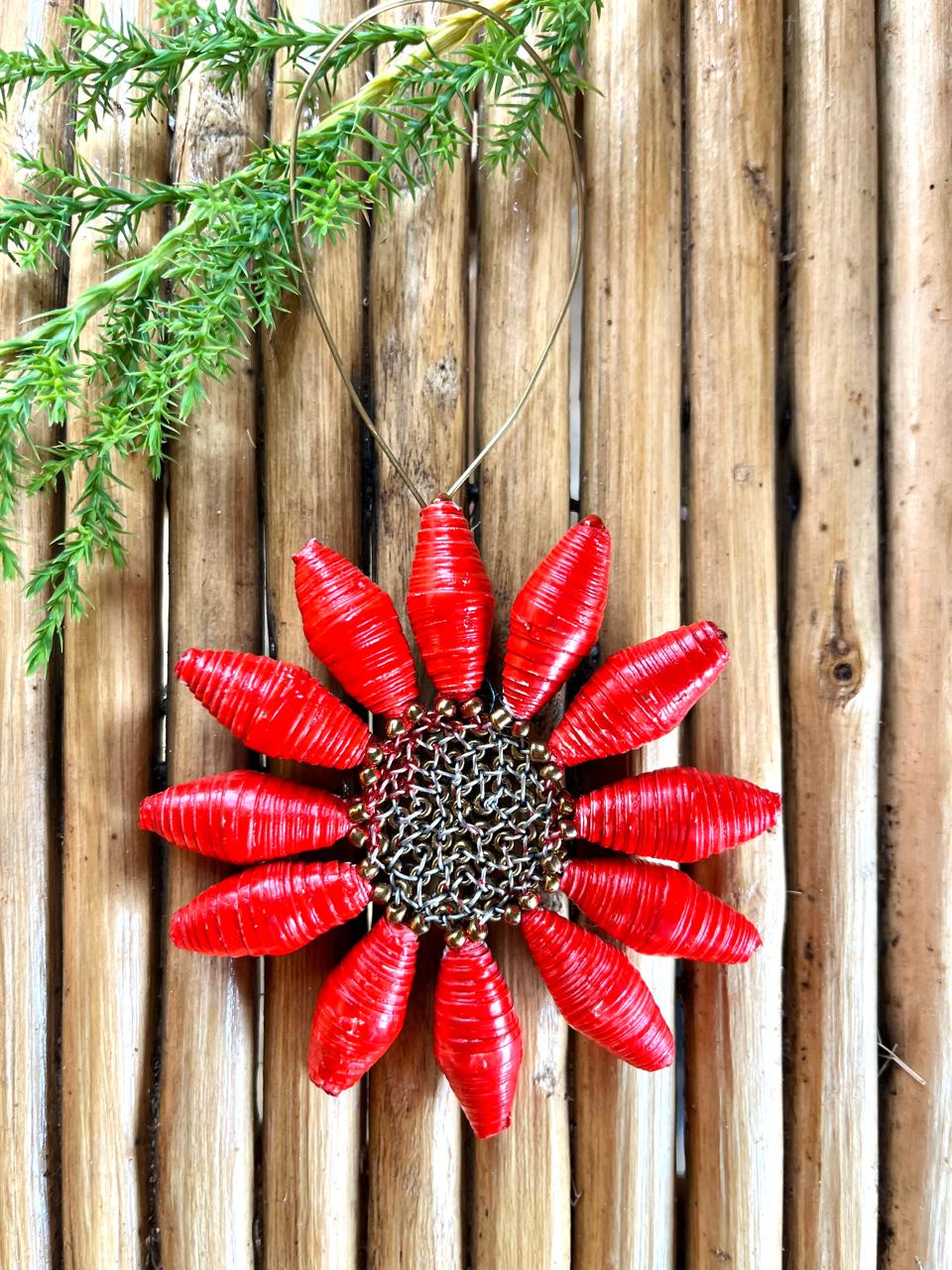 Featuring red paper beads shaped into a delicate flower, our Paper Bead Flower ornament includes a textured center pistil crafted from a mixture of brass chain and seed beads. This unique ornament is ideal for nature lovers looking to bring a warm, handcrafted feel to their seasonal decorations.