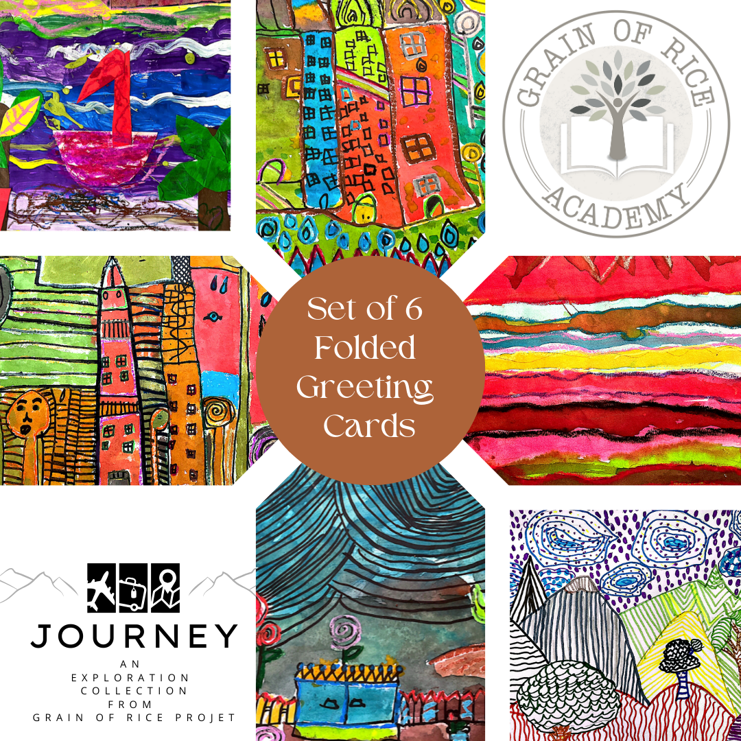 Each set includes 6 different folded cards and envelopes. The proceeds from the sale of these card sets return to Grain of Rice Academy to help us provide materials and resources to further enhance student creativity and learning.