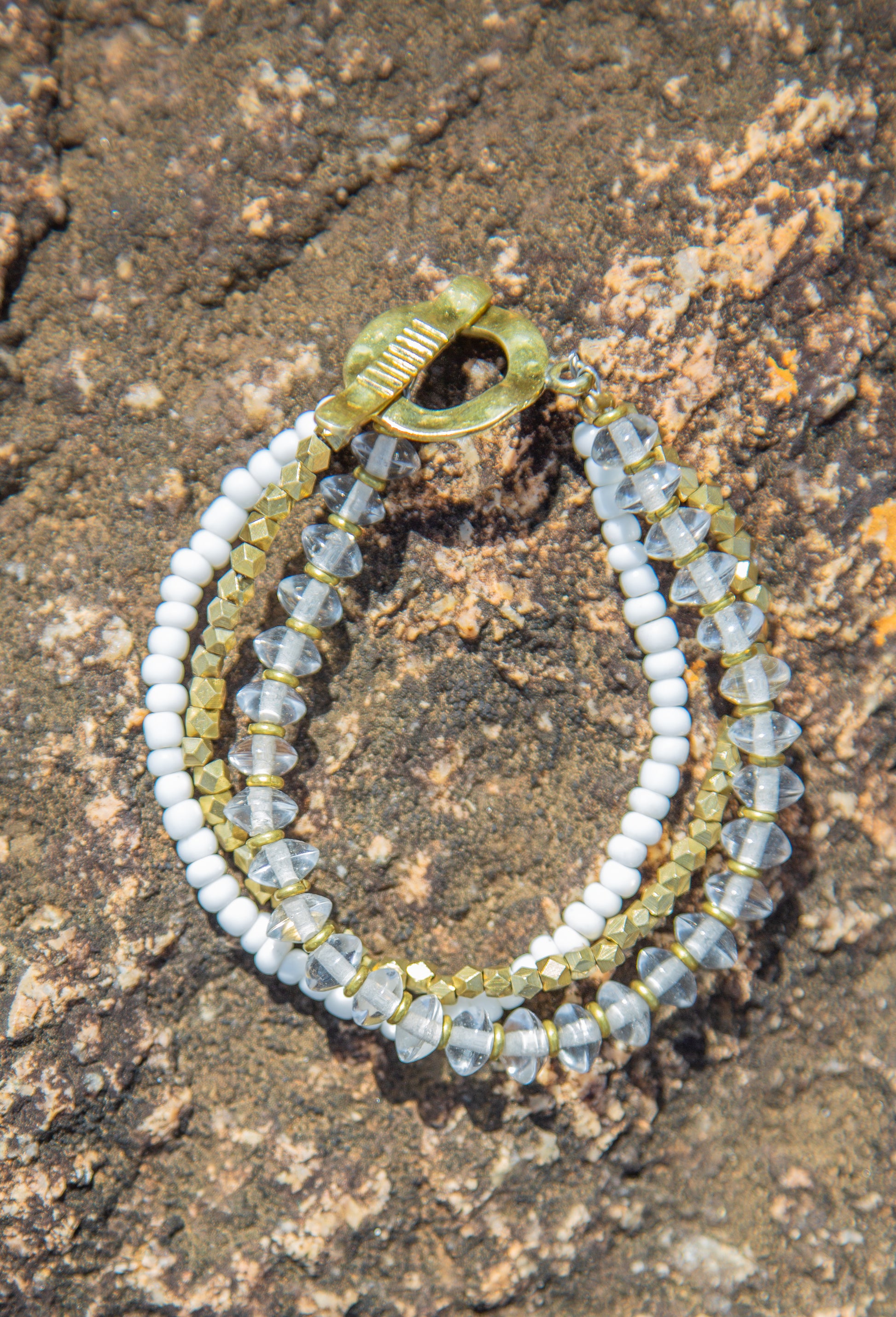 Some journeys are clear cut and some have multiple layers to them - this bracelet features both. Made from strands of beads, brass, and recycled glass imported from Ghana.