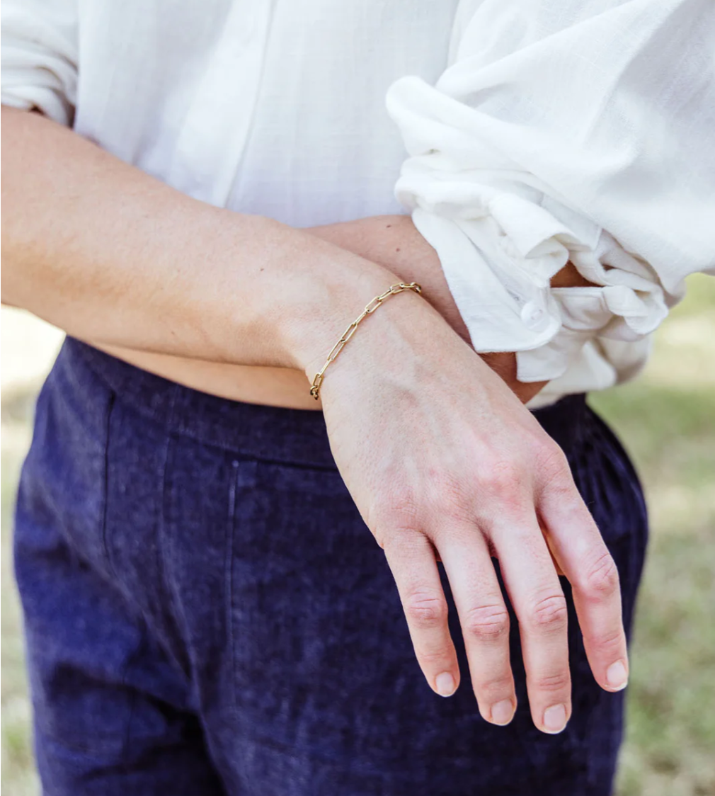 Our Linked Bracelet stacks well with other bracelets or can be worn on its own, complementing a wide array of outfits. Each link represents a connection within ourselves as well as a connection to each other. Our artisans find brass locks and tops that have been discarded, melt them down and cast them into new pieces, not only creating beautiful jewelry but also opportunities for dignified employment.
