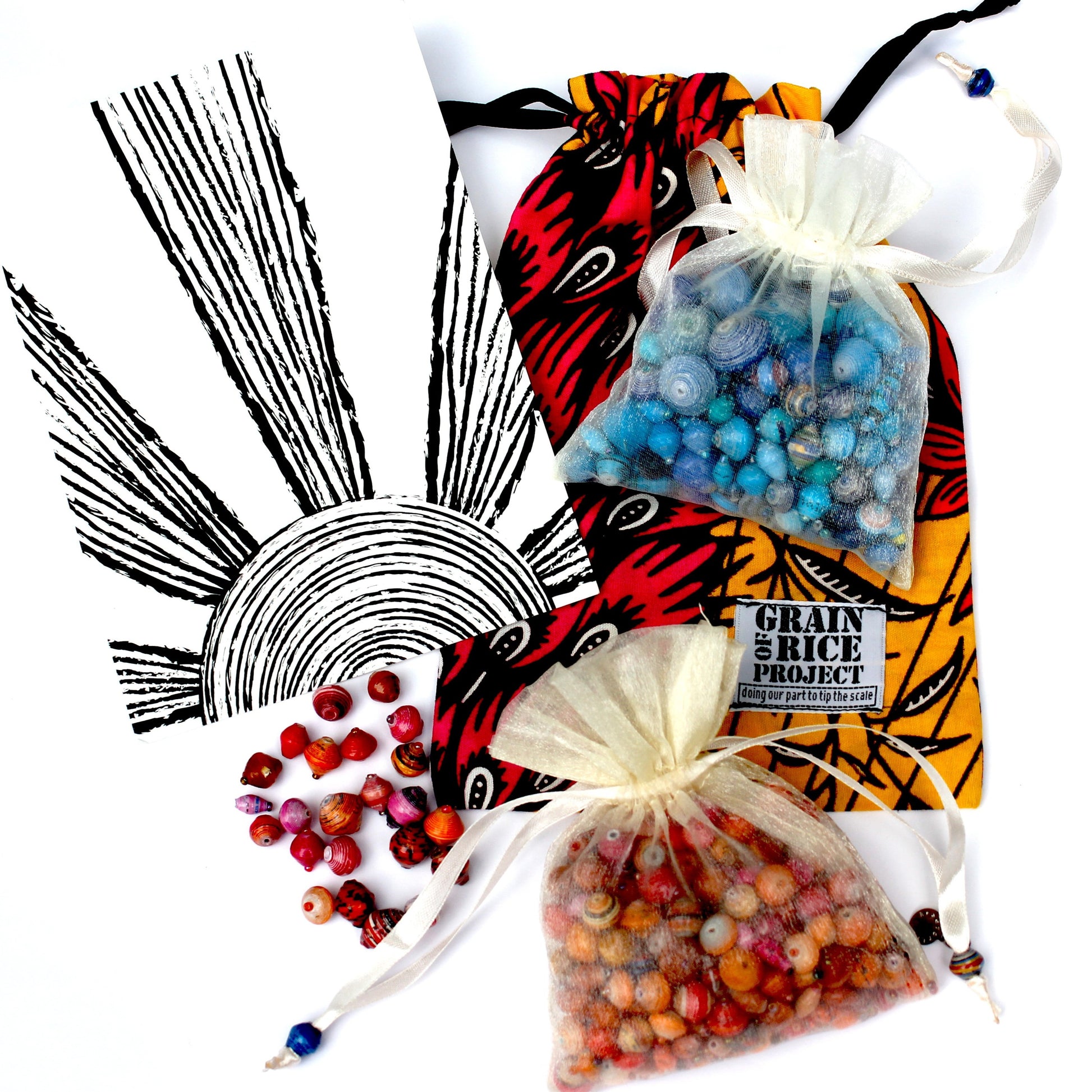 Get ready to be artsy with this super easy set, inspired by the theme "Brighter Days Ahead." There are multiple possibilities of things to make with these paper beads. We've included directions for creating your own mosaic with these paper beads. All you need is glue and a picture frame for display. Or, paint the sun design (printed on beautifully textured beverage coaster paper) with your own watercolors and string the beads together to make your own bracelet (you provide the string). The sky is the limit. Each kit contains sun picture, 2 bags of beads, and a drawstring African print bag.