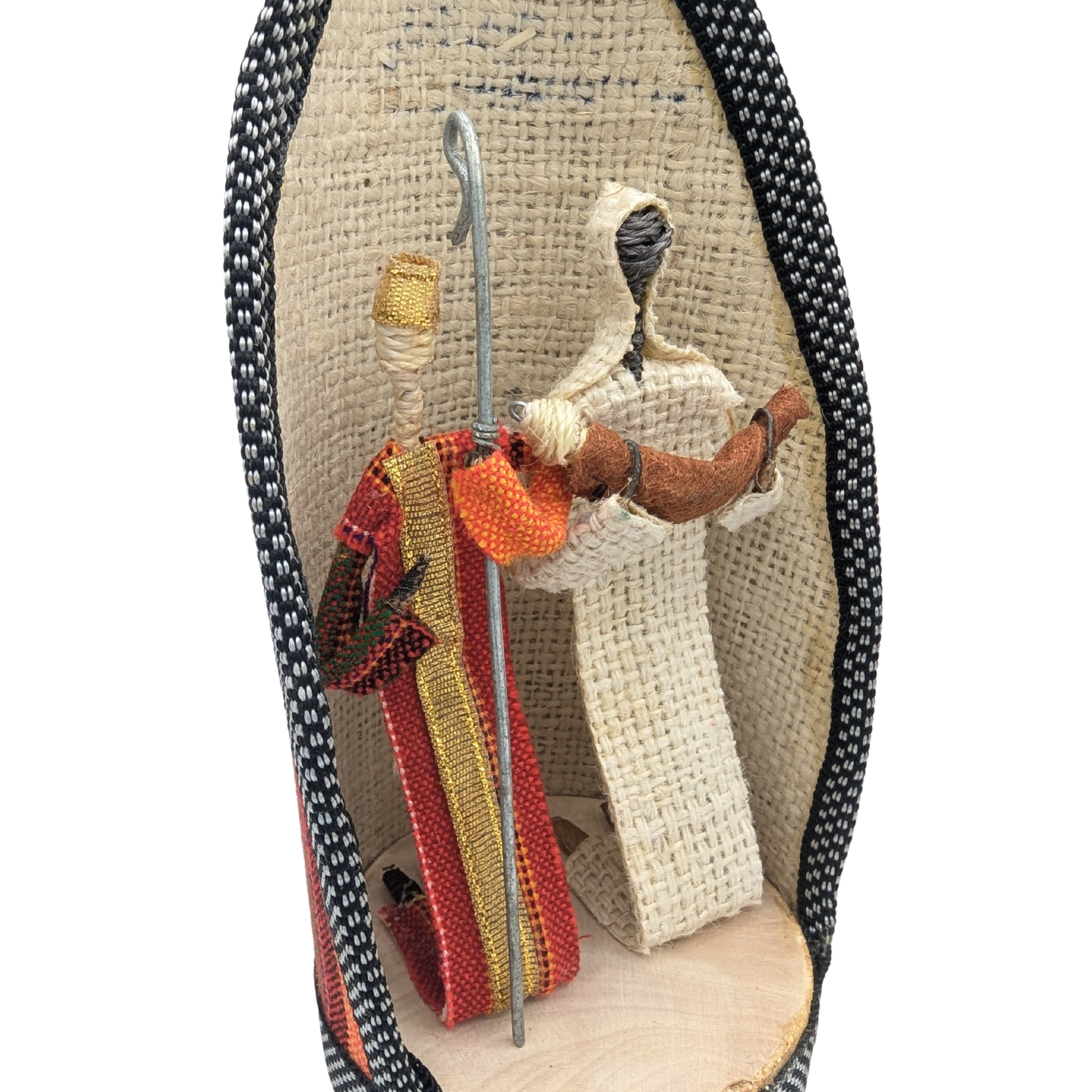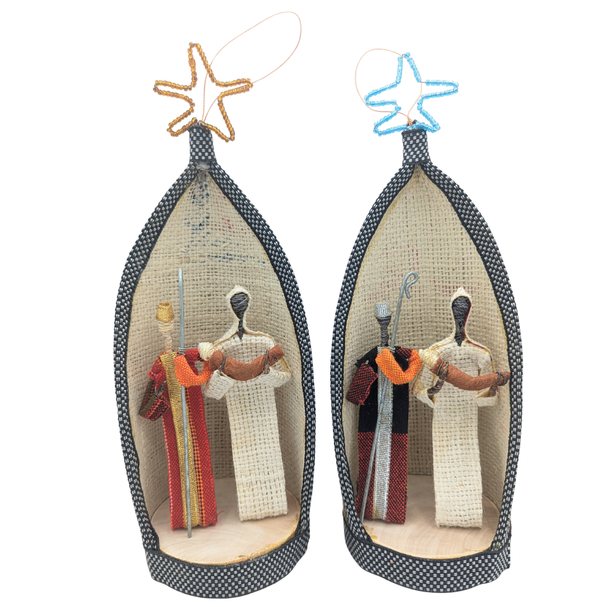 This one of a kind nativity is the perfect addition to your holiday decor. Made by hand, each piece uses differing fabrics for the garments of the Holy Family making, each piece unique. Each nativity is surrounded by a backing made of traditional Masai fabric and finished with a beaded star. The nativity has a base as well as a hanger for your display preferences.