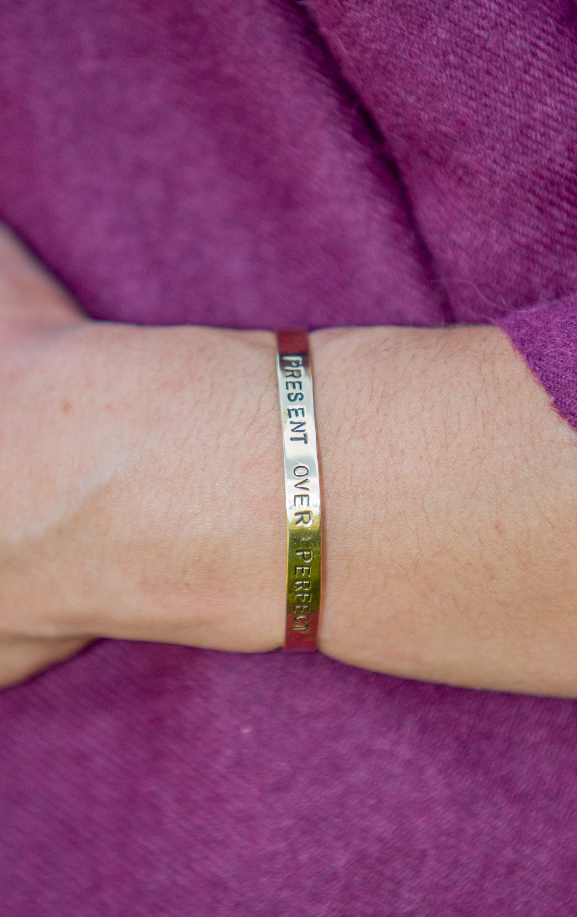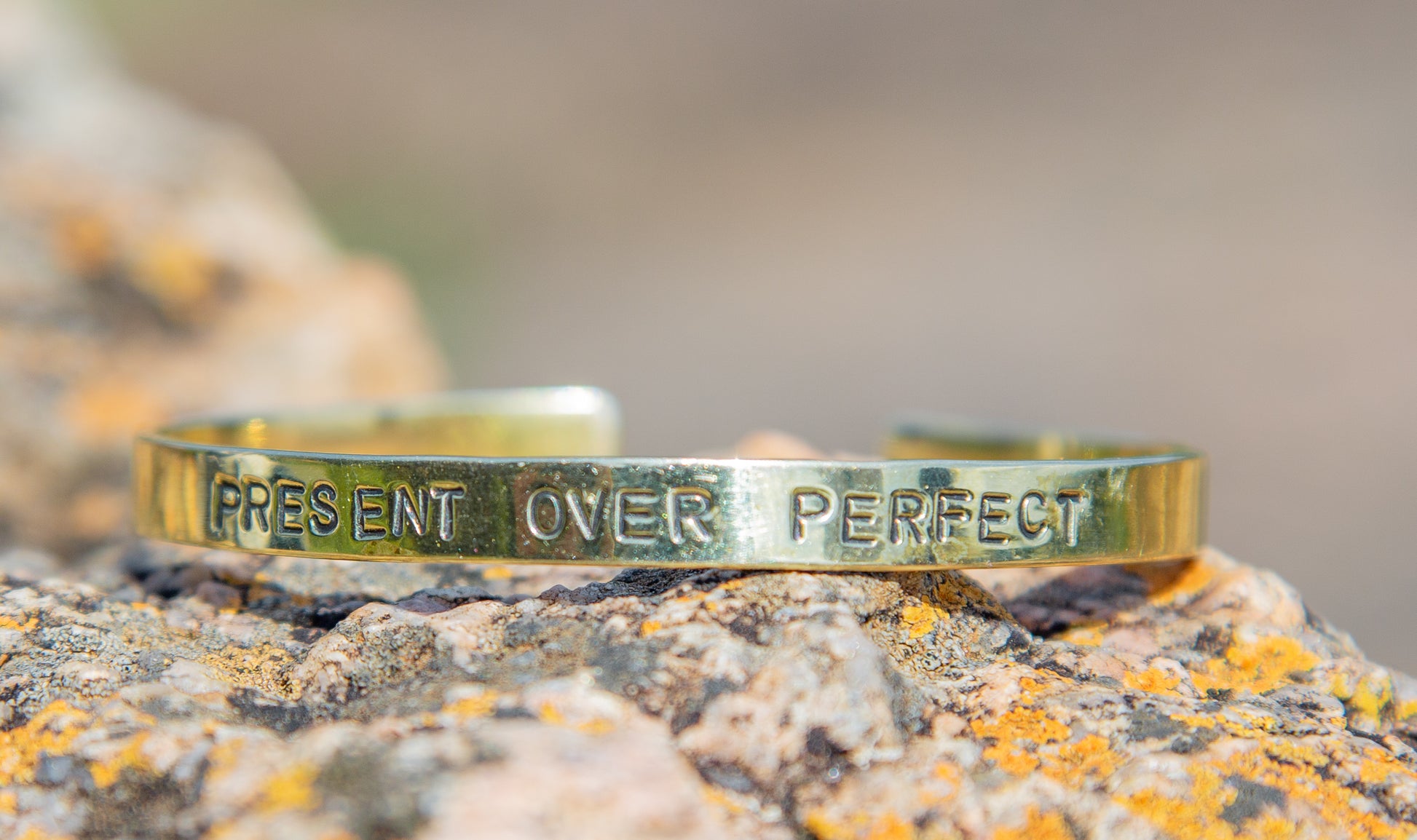 Mindset matters in life. This brass bracelet is a reminder to be PRESENT OVER PERFECT in all journeys. Each letter on the bracelet is hand stamped by an artisan who has molded the bracelet using repurposed brass. Great for layering with other bracelets.