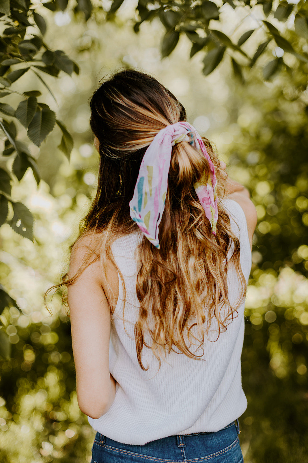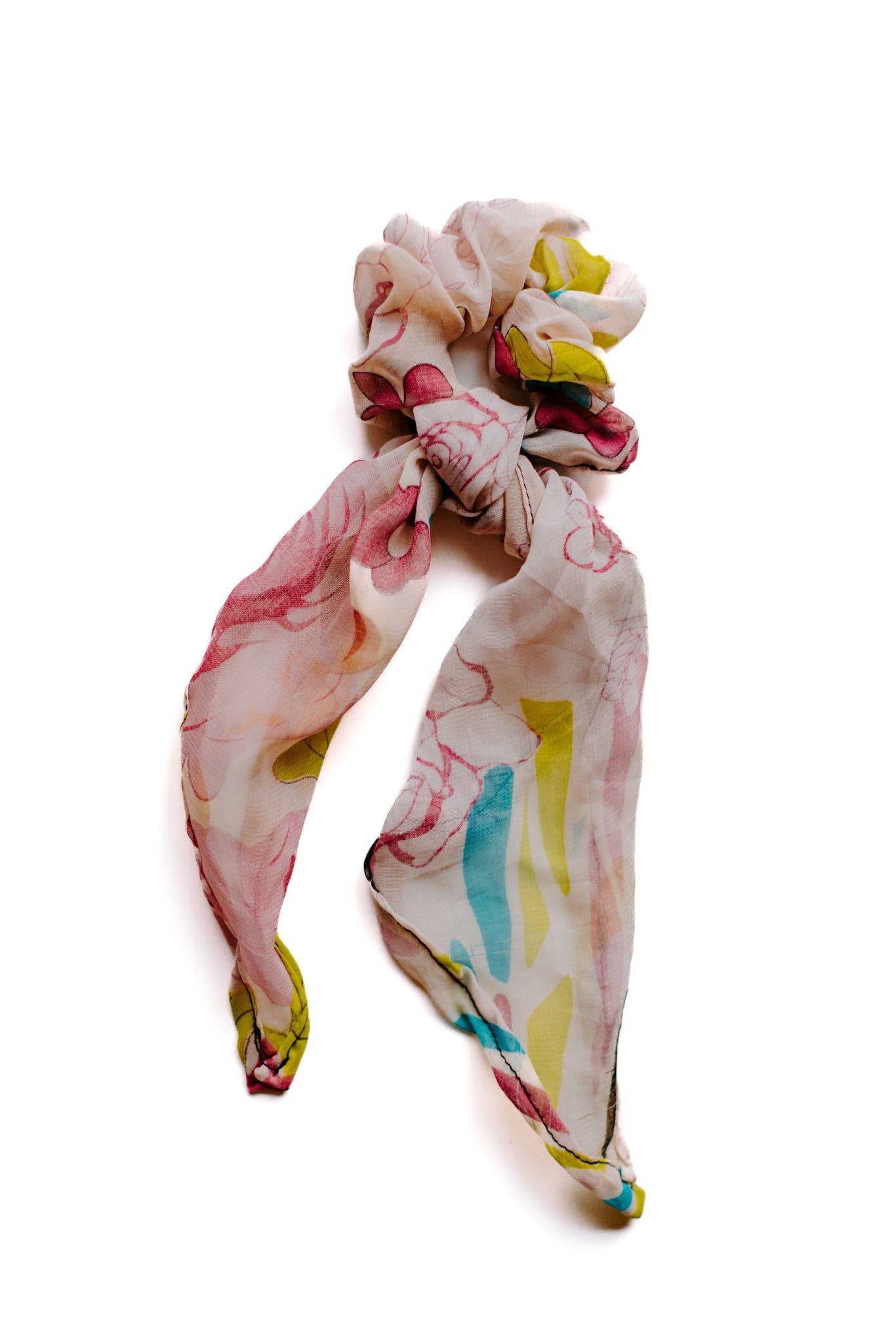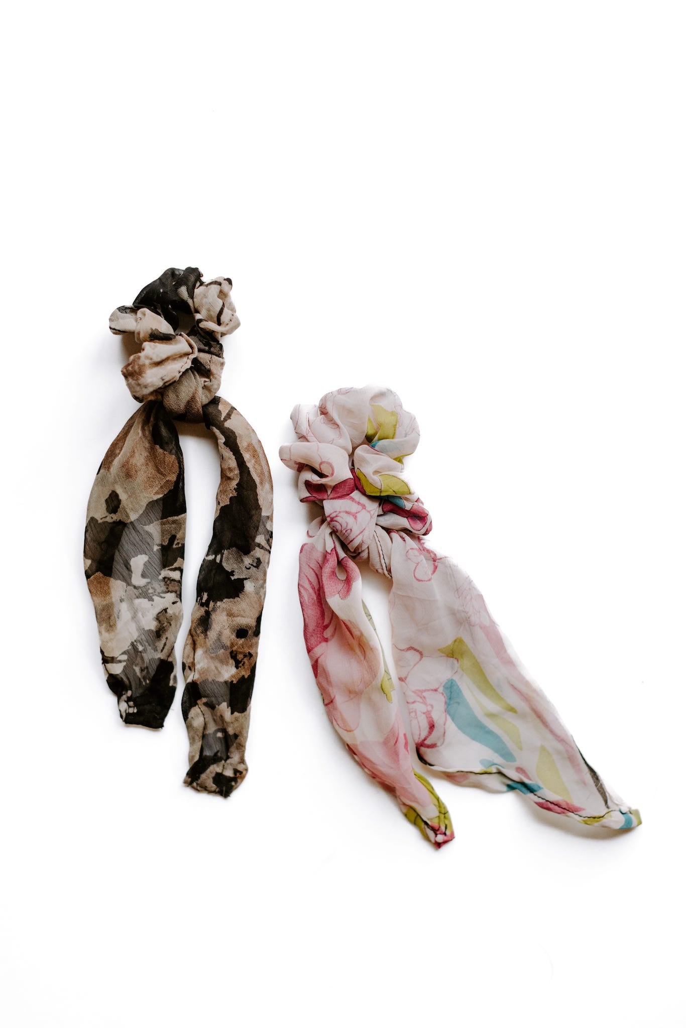 Stay on trend with our Print Scrunchies. Created with elastic and silk scarves. No two are alike - choose from darker shades or brighter hues.