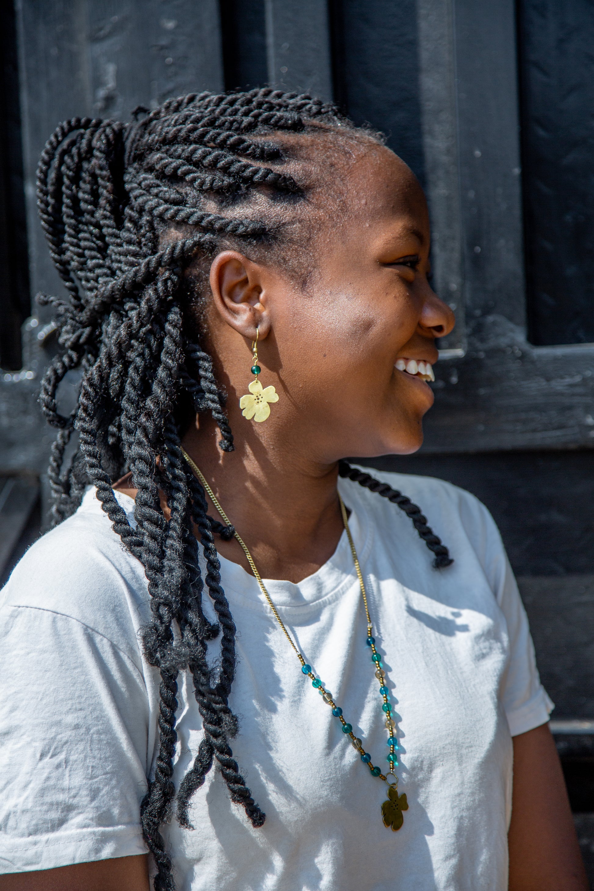 Named for the Sun Drop flower, these beautiful earrings feature four hand-cut brass petals. Offset with a blue-green bead, the earrings pair well with outfits of all styles.