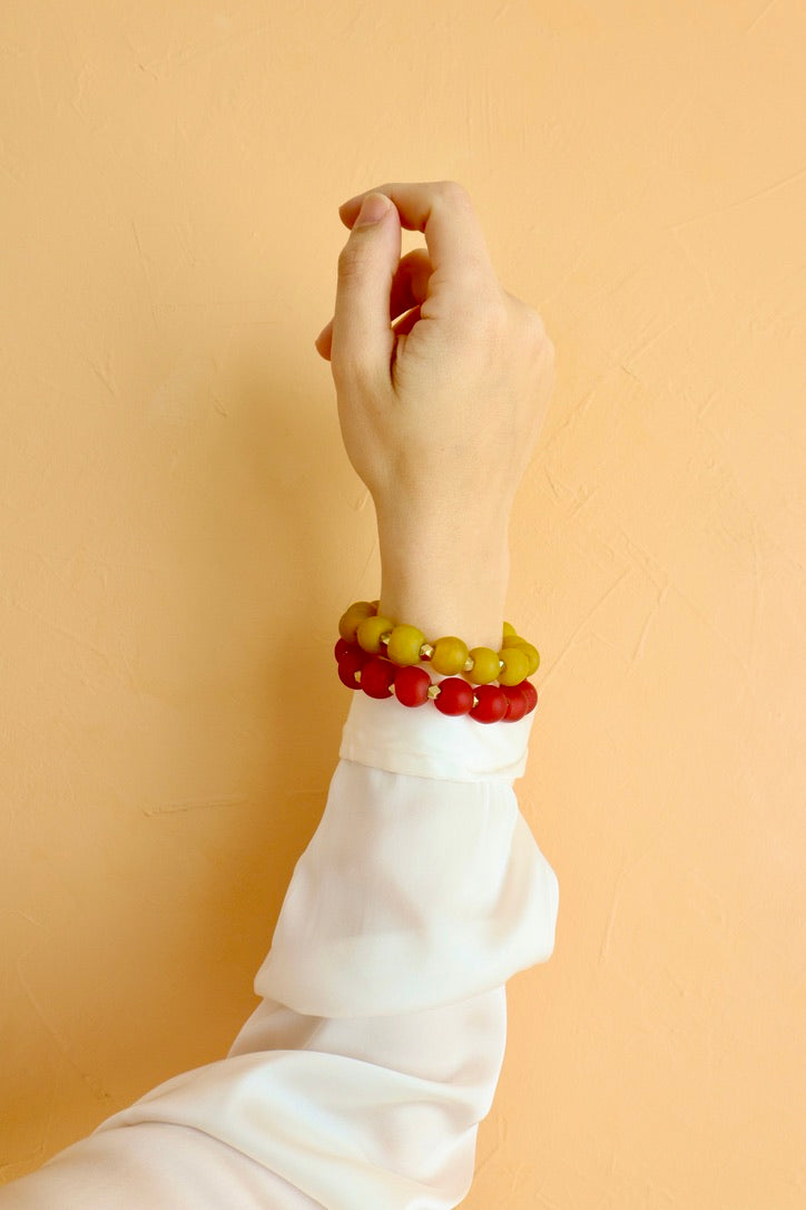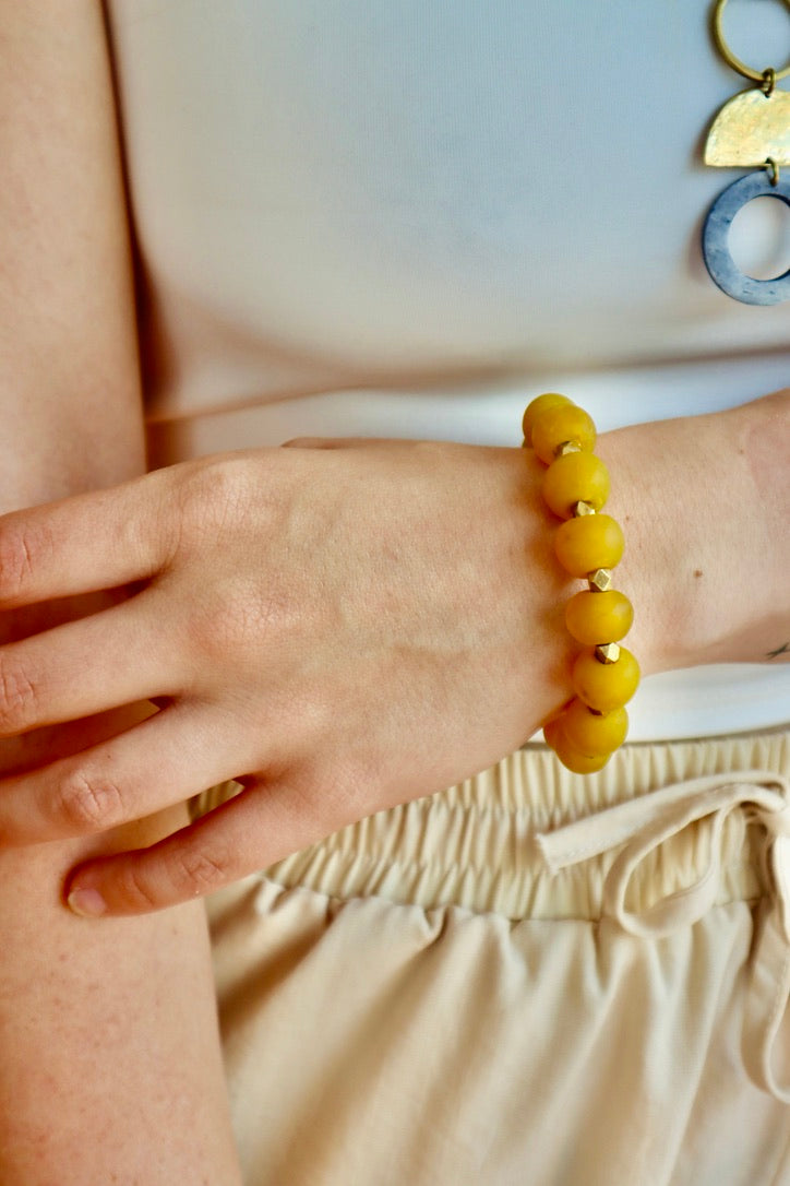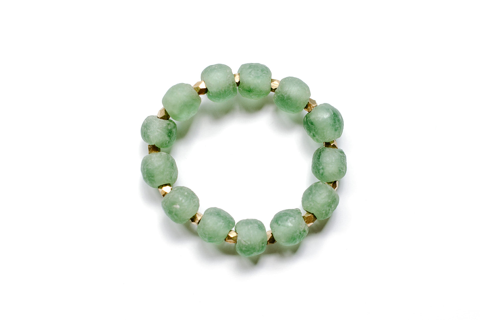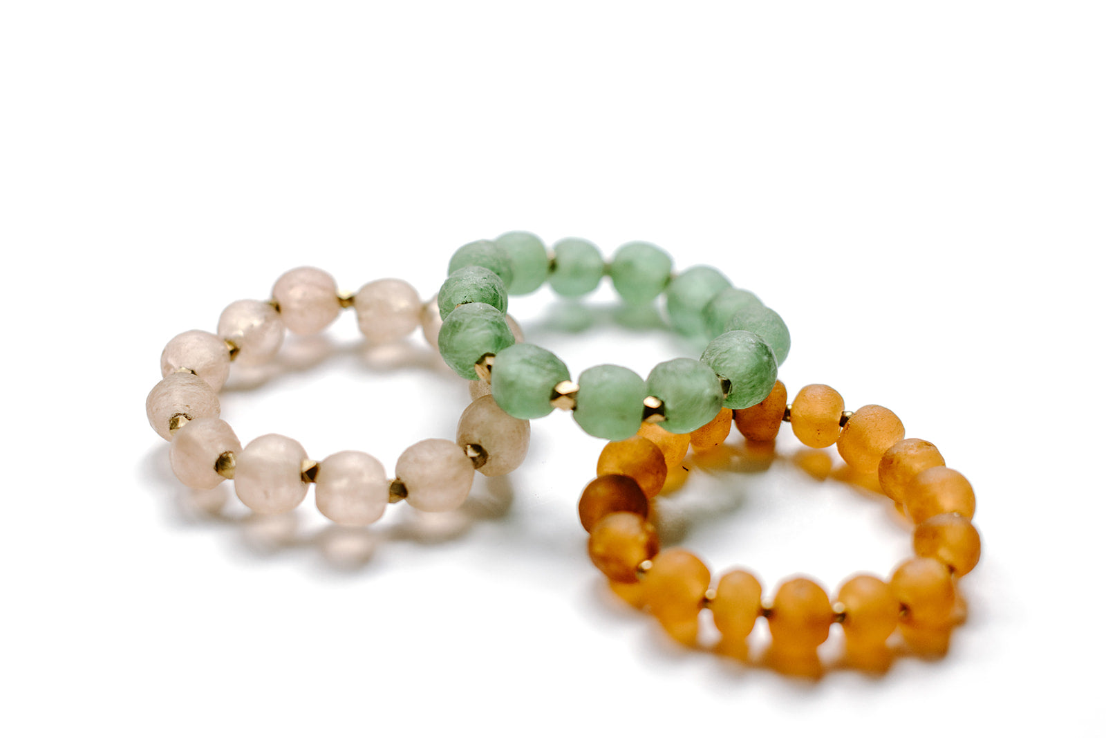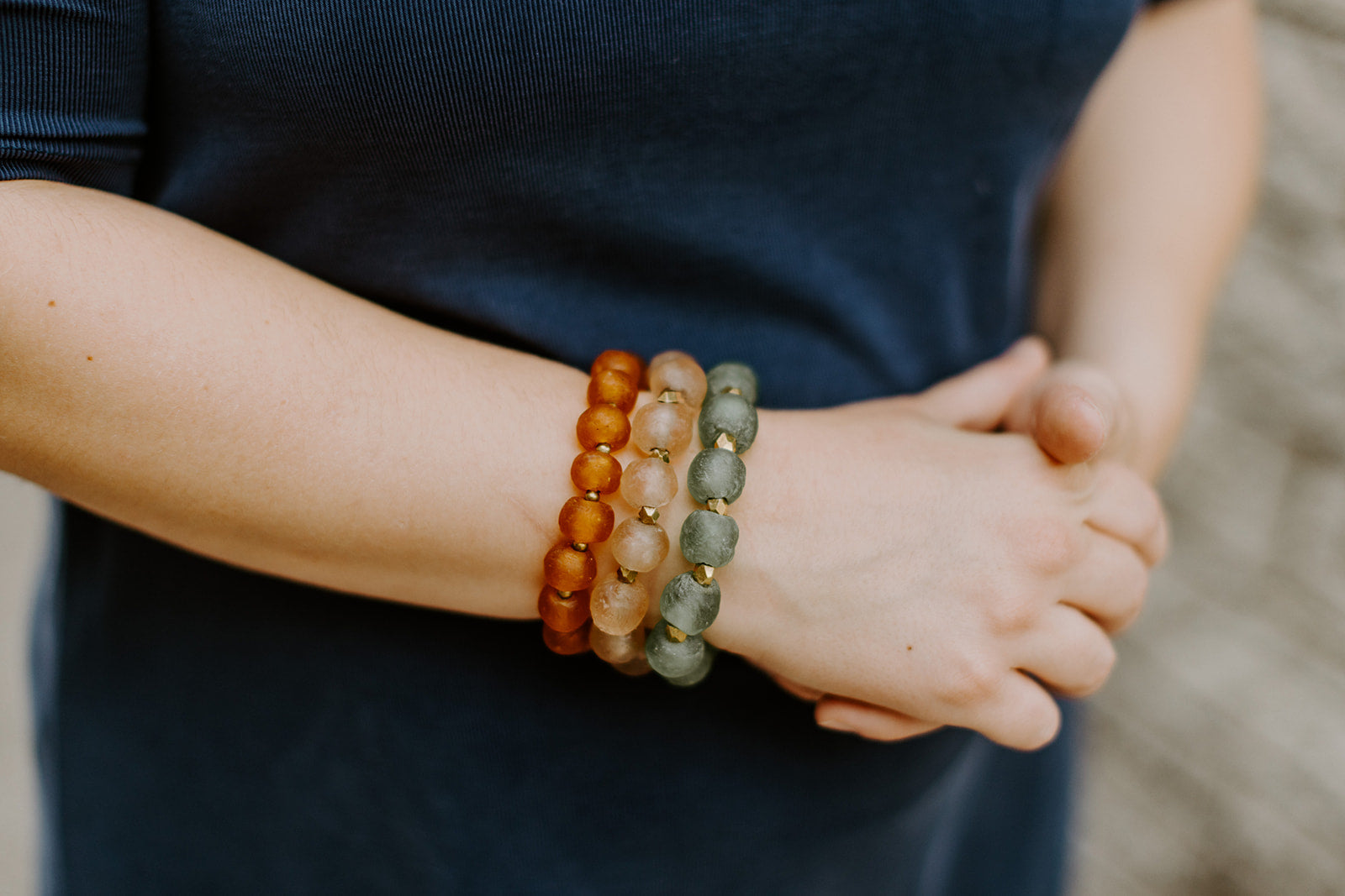 Our Unity Bracelet represents our mission of cultivating a Christ-like culture where everyone, all tribes, all races, and all people belong. Each bracelet is handcrafted using recycled glass beads from Ghana, adorned with a geometric brass bead in between each bead and strung on an elastic band that fits most wrist sizes.
