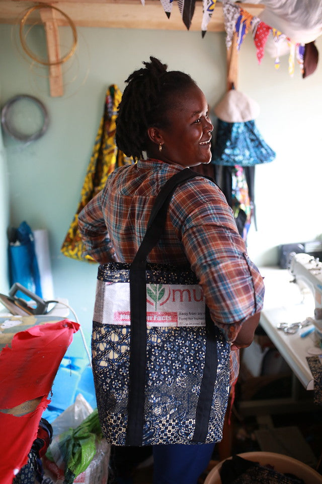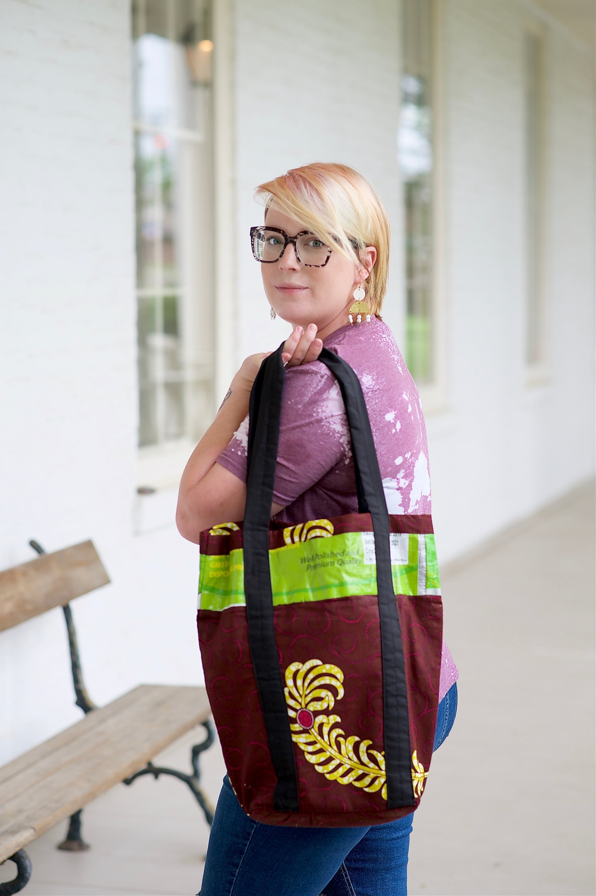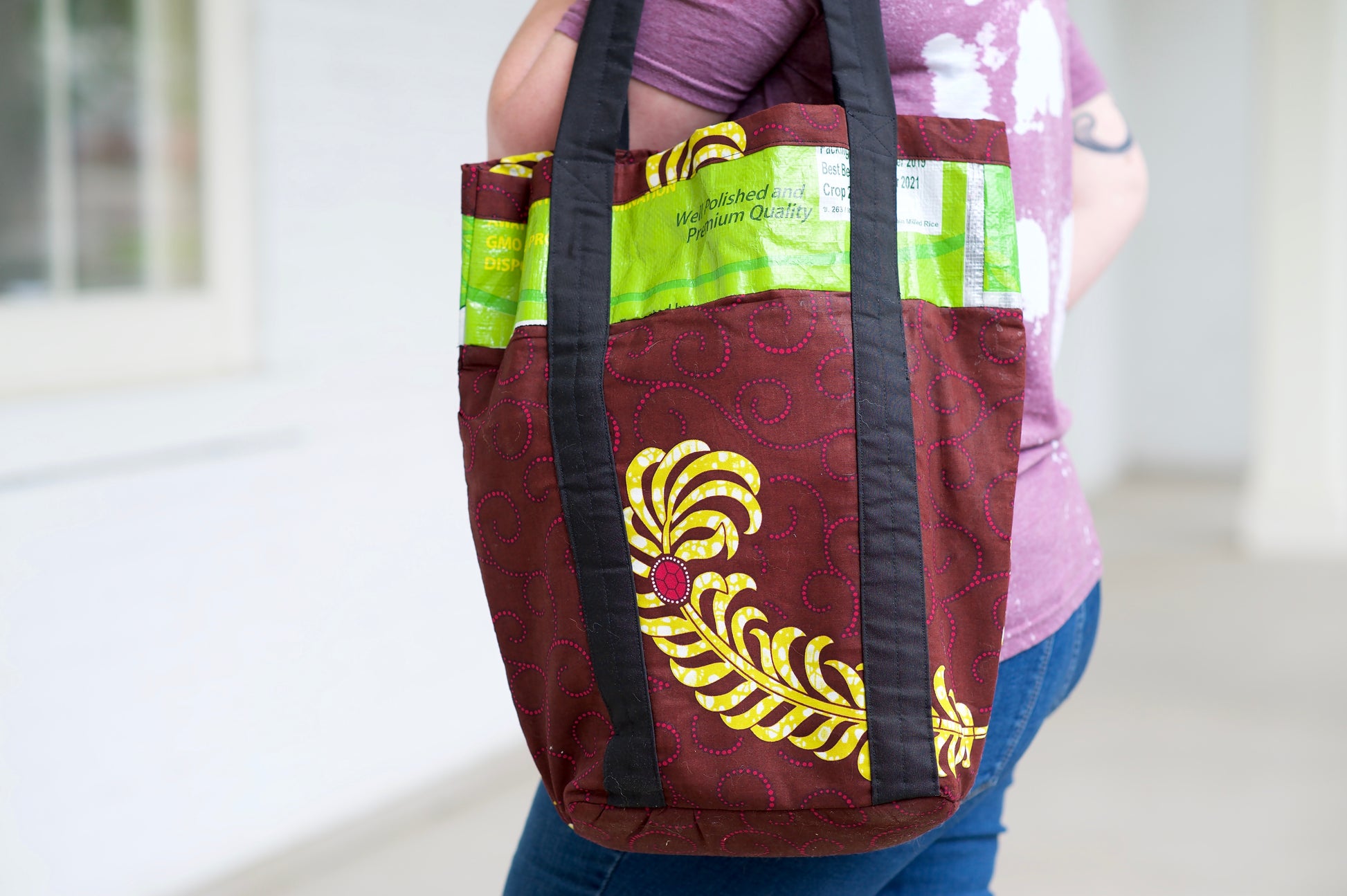 Eco-friendly and practical, this bag is created with recycled rice bags. Rice is often packaged in bulk, and these totes are a great way to take something that would normally be thrown away and create something new. Patterns and fabric and rice bag colors will vary depending on availability.