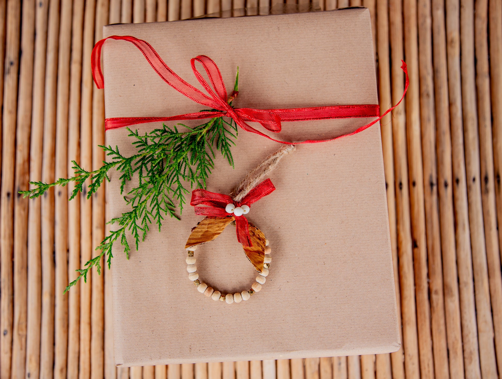Our Wooden Wreath Ornament is a new design from our team in Kenya this year! A series of wooden beads is set off by brass beads that loop together before being topped with banana tree bark leaves and a red ribbon bow. Simple in design, it makes for a perfect ornament or can be used to further decorate a wrapped gift.